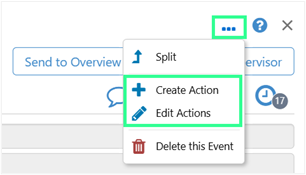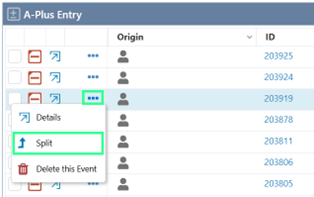 The split option has been added to the ellipsis menu in the A-Plus entry table and has the same security privileges as A-Plus. If any of the user's roles have contribute privileges on the workbook, the Split option becomes available, and the event can be split.