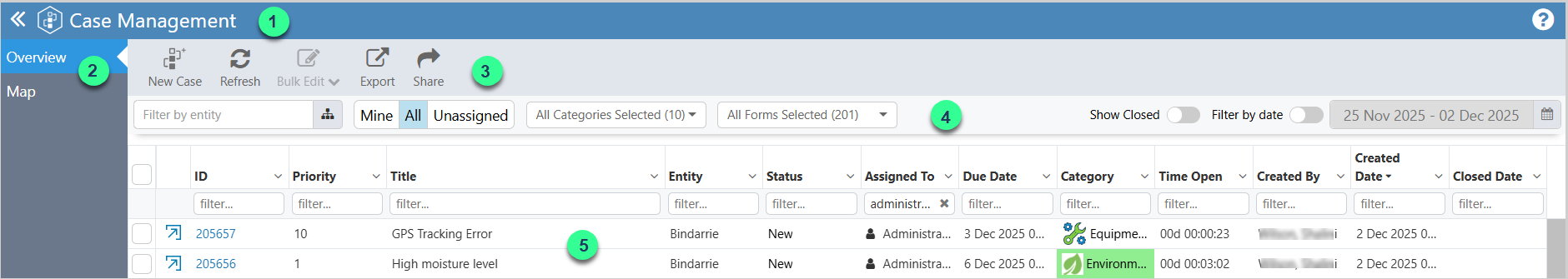 | 1. | Case Management Header | The Case Management header displays Case Management as the active workspace title. It includes the Hide Pages List Icon |
