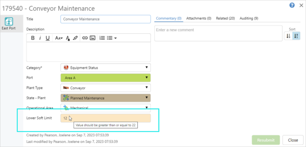 In Case Management, when the value of a field is outside of the lower or upper soft limits of a field, the field background colour is changed, and a tooltip will display on hover.
