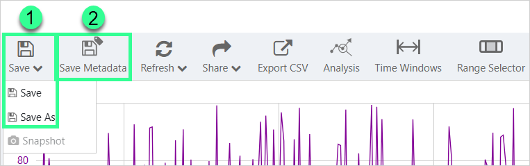 The Save button has 2 options available in a drop-down list: Save is used to save to the current trend name and workspace. Save As is used for saving the trend to a specified name and workspace.