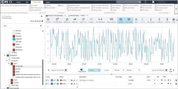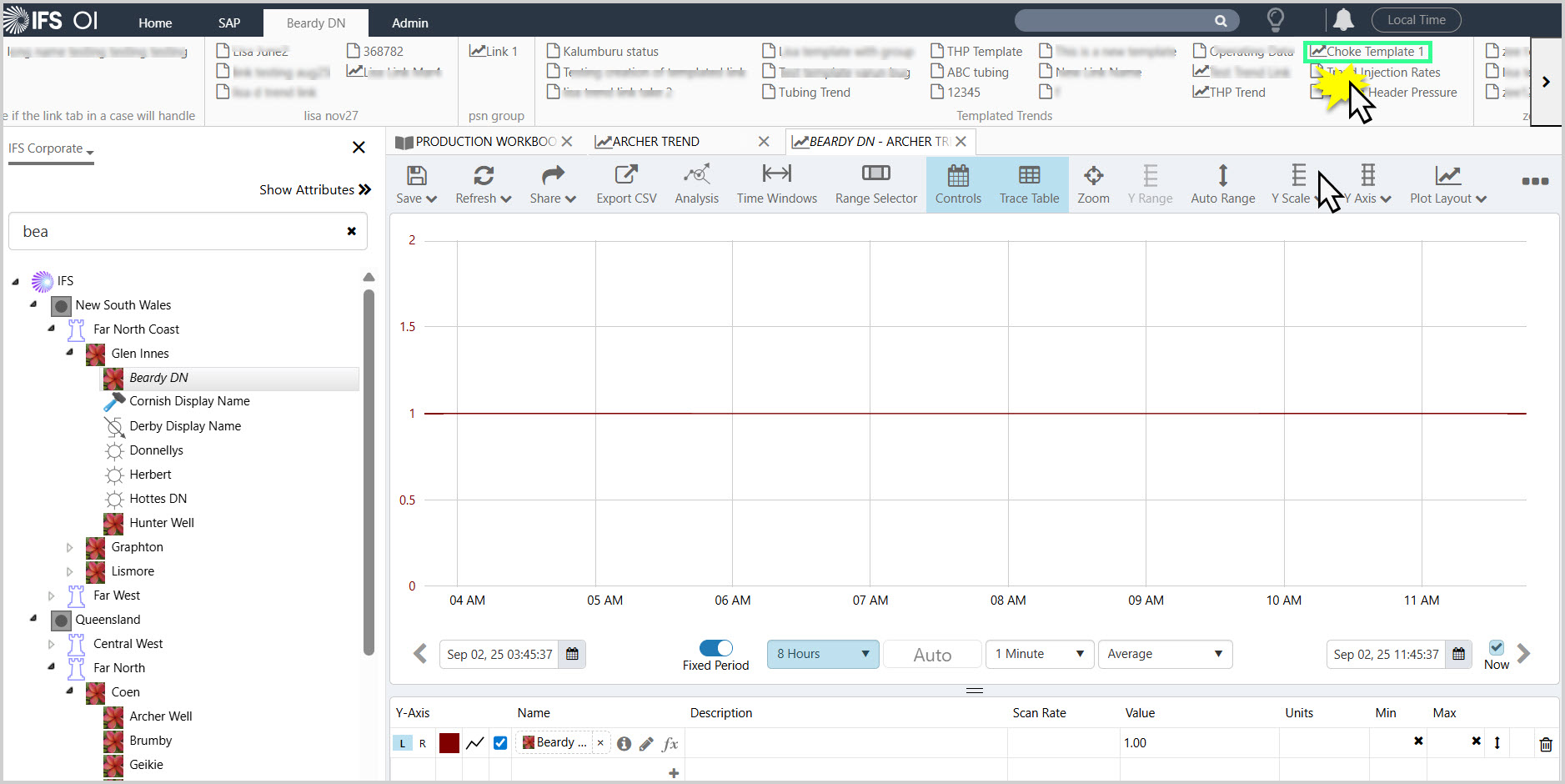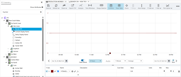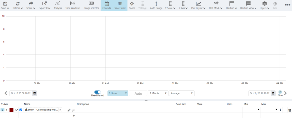 When you select an entity, the trend gets populated with the relevant data. In the example below {entity[Oil Producing Well]:Choke!Current Position} was entered into the Name field and the template was saved.