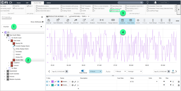 In this step, we're going to click on an entity to open its Table of Contents tab on the Explorer Ribbon, then click on the link to the trend. Once the trend is open, you can click on other entities in the hierarchy to change the entity context in the trend, or you can click the button on that entity's table of contents, to open another trend in a new tab.