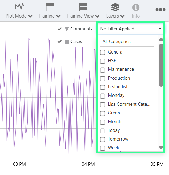 Hover over a marker to display a tool tip and click on a marker to open the case or comment in the Explore panel. Case marker on a trend: Comment marker on a trend: