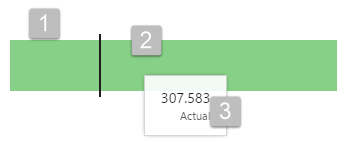This bar is green for 'desirable' outcomes, and grey for 'undesirable' outcomes; in some cases, an actual exceeding a target is seen as 'desirable'; in other cases it is preferable to come below the target (for example, where the target represents a budget). The target bar is configured, accordingly.